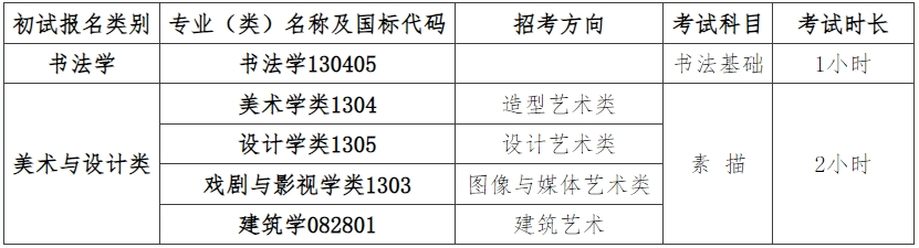 初试:考生可在初试报名类别“中国画”、“书法学”、“美术与设计类”中选择一类报名。其中:“书法学”、“美术与设计类”参加初试,“中国画”专业初试报名后直接进入复试。