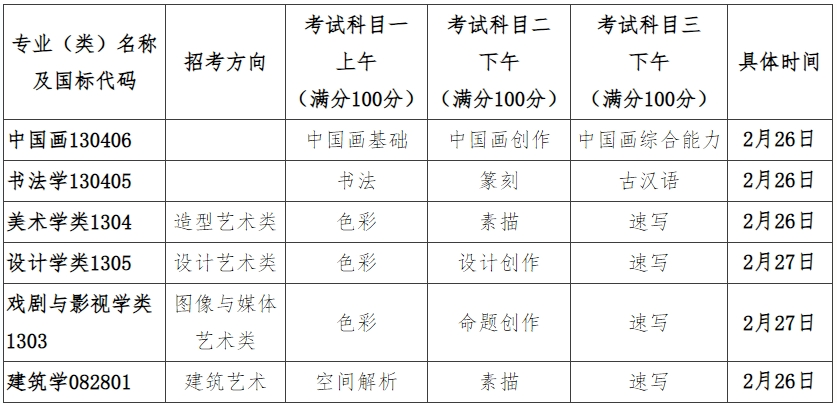 复试:“书法学”专业初试合格考生按书法学专业报名复试;“美术与设计类”初试合格考生只可从“美术学类”、“设计学类”、“戏剧与影视学类”、“建筑学”中选择一个招考专业(类)报名复试,“中国画”专业初试报名考生直接参加中国画专业复试。各招考专业(类)不得兼报。