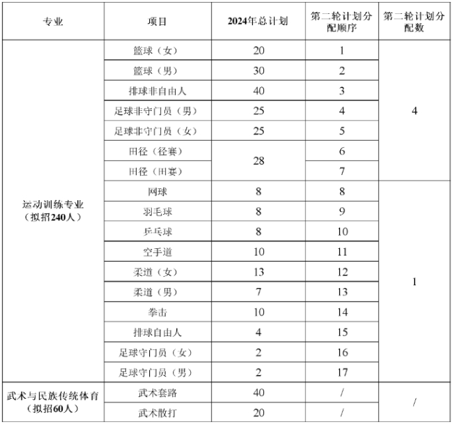 2、运动训练专业优先录取文化课与专项成绩双上线第一志愿考生;若个别项目第一志愿考生全部录取结束后仍有剩余招生计划,将所有录取不满额的专项剩余计划在本专业继续进行第二轮计划分配,按照分项目计划表第二轮计划分配顺序和计划分配数,分配到仍有第一志愿生源的其他项目,录取其第一志愿考生(如项目一志愿生源不足时,则该项目直接跳过),若所有项目第一志愿考生全部录取后,仍有剩余招生计划时,在国家体育总局启动第二志愿录取程序后,录取第二志愿考生。