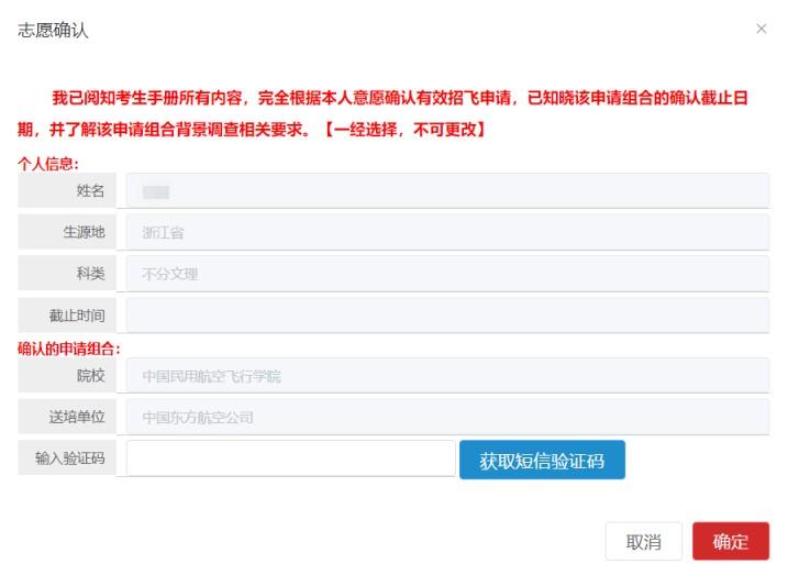 手机浏览器访问系统,登录后点击【报考结果】菜单,向左滑动数据列表,在确认栏点击【提交】按钮,弹出框中点击【获取短信验证码】后,输入验证码进行招飞申请确认。