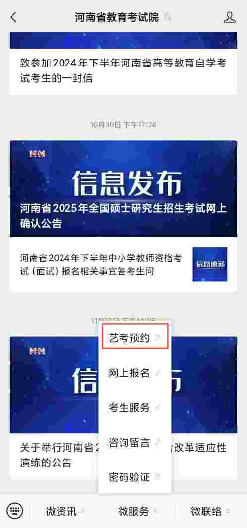 点击“河南省教育考试院”微信公众号菜单,选择【微服务】->【艺考预约】,进入艺考预约的小程序,进行预约操作。