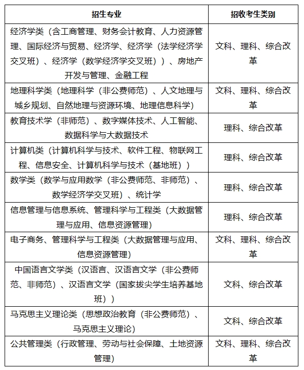 备注:考生在系统报名只需填报文科类、理科类、综合改革类,在高考填报志愿时再填报专业。各省(市、区)最终招生专业以省级招生考试机构公布为准。我校高校专项计划不招收新疆双语类考生。