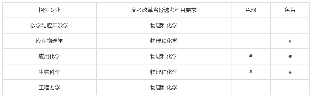 我校招生专业包括数学与应用数学、应用物理学、应用化学、生物科学和工程力学。所有招生专业在非高考改革省份招收理科考生,在高考改革省份选考科目要求见下表:
