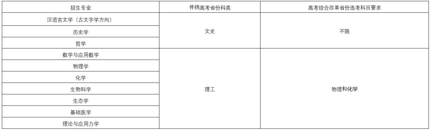 (一)强基计划招生专业包括汉语言文学(古文字学方向)、历史学、哲学、数学与应用数学、物理学、化学、生物科学、生态学、基础医学、理论与应用力学。招生科类和高考改革省份选考科目要求如下: