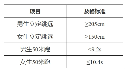 3.考生需参加由我校组织的体质测试,测试项目可自主选择立定跳远或50米跑。体质测试不受理缓考、补考申请。体质测试及格标准如下: