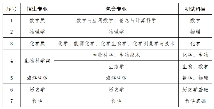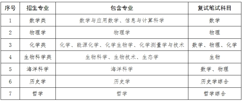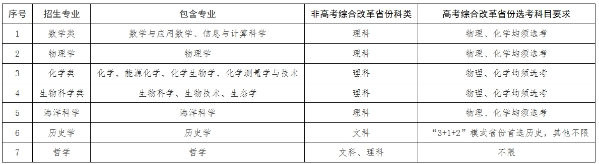 聚焦国家关键领域以及人才紧缺领域,突出基础学科支撑引领,结合学校国家一流建设学科、基础学科拔尖学生培养计划2.0以及学校优势学科,2024年我校在数学类、物理学、化学类、生物科学类、海洋科学、历史学、哲学等专业进行招生。具体招生专业、招生科类及选考科目要求如下: