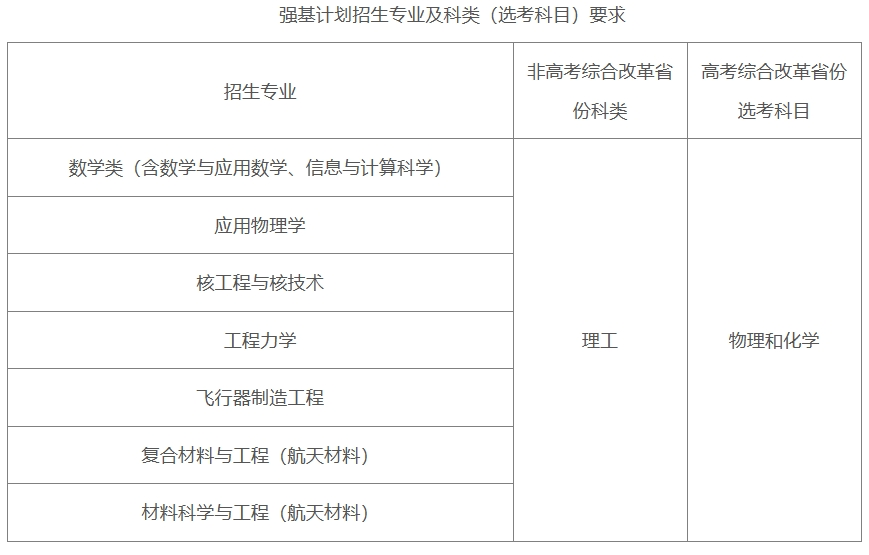 我校强基计划的招生专业、非高考综合改革省份科类要求及高考综合改革省份的选考科目要求见下表。