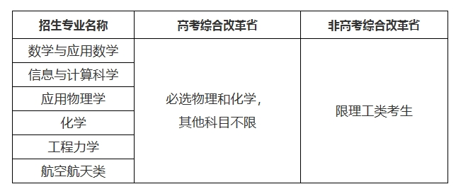 为全面贯彻全国教育大会精神,深入落实《国务院关于深化考试招生制度改革的实施意见》(国发〔2014〕35号),根据《关于在部分高校开展基础学科招生改革试点工作的意见》(教学〔2020〕1号)等文件,服务国家重大战略需求,加强基础学科拔尖创新人才选拔培养,经批准,我校自2020年起开展基础学科招生改革试点工作(也称“强基计划”),探索多维度考核评价模式,选拔一批有志向、有兴趣、有天赋的青年学生,培养具有空天报国情怀、扎实数理基础、科学创新能力、全球视野格局的高素质拔尖创新人才,为国家重大战略领域输送后备人才。