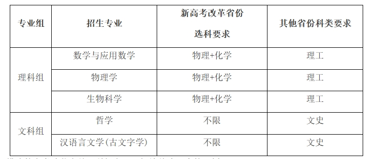 服务国家重大战略需求的基础理科学科以及国家人才紧缺的社会科学与人文学科领域,招生专业、选考科目、科类要求及招生计划见下表:
