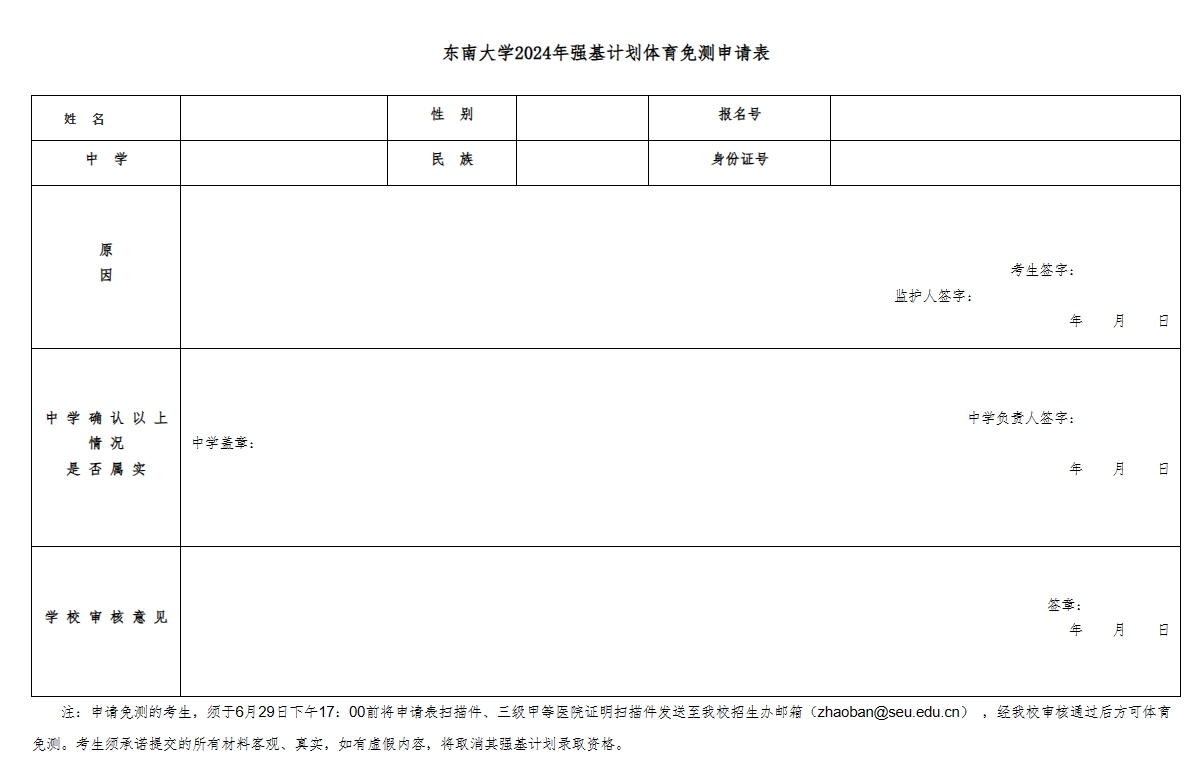 七、其他事项:考生需购买测试期间个人“人身意外伤害保险”,测试当天查验保险单据原件。考生因残疾等身体原因可申请体育免测,须填写附件《东南大学强基计划体育免测申请表》,由中学负责人签字审核,并提交三级甲等医院证明,经东南大学核准,可体育免测,免测成绩为合格等级。