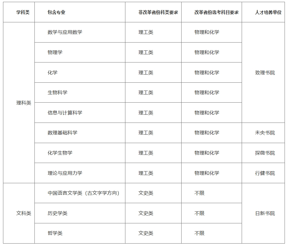基础文科类专业包括:中国语言文学类(古文字学方向)、历史学类、哲学类专业,旨在选拔并培养在基础文科领域有特长且有志于从事相关研究的学生。
