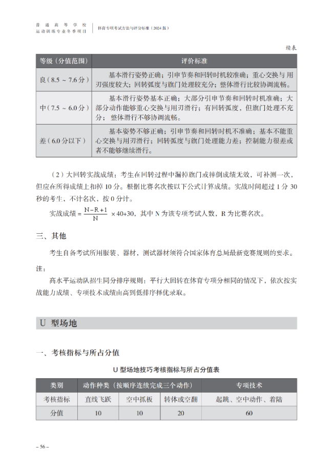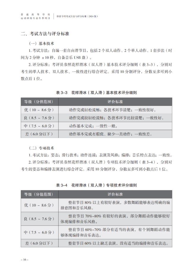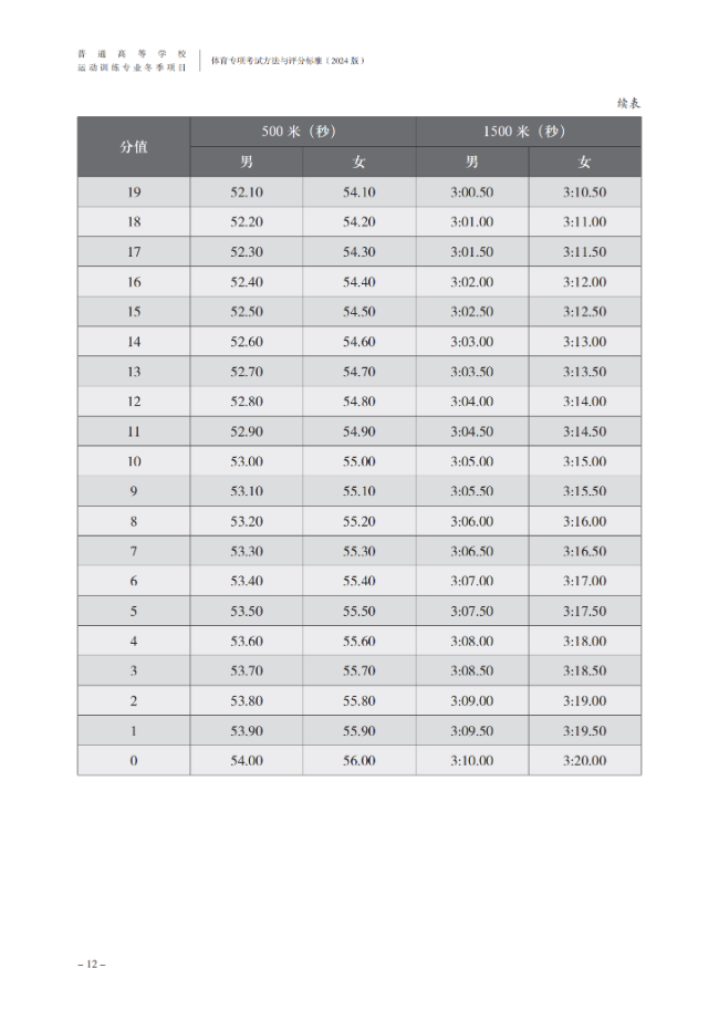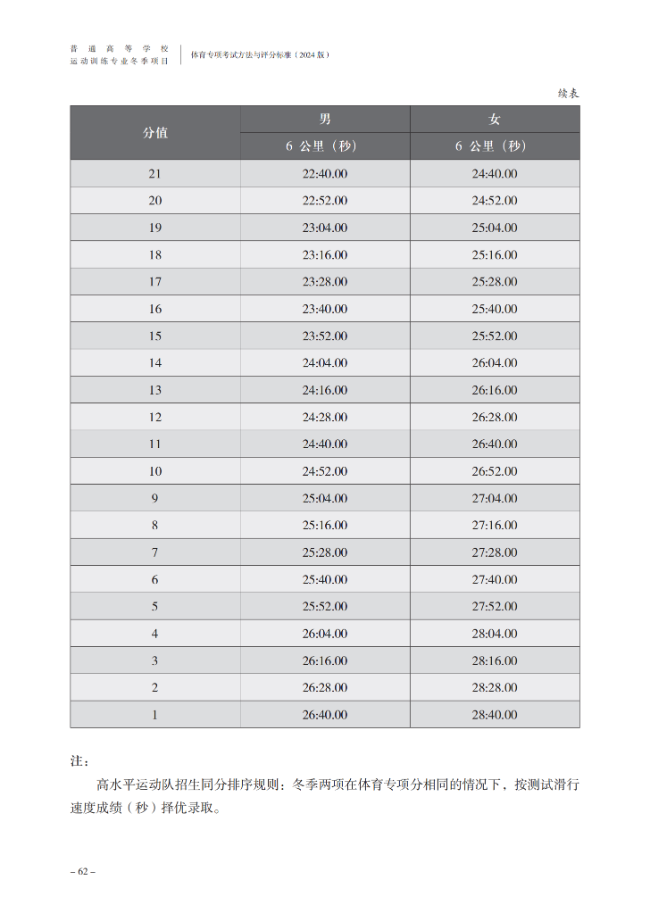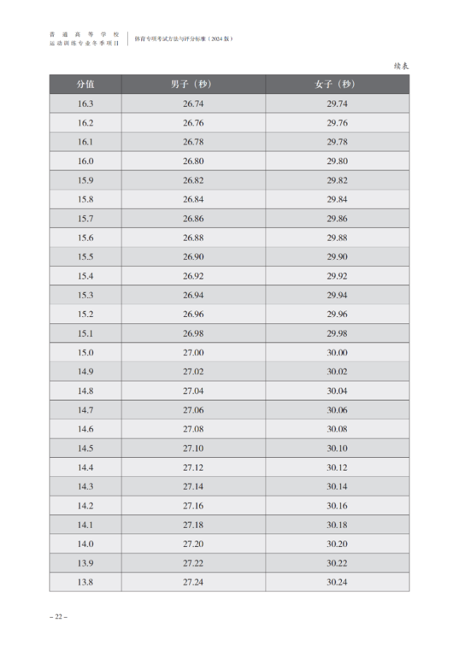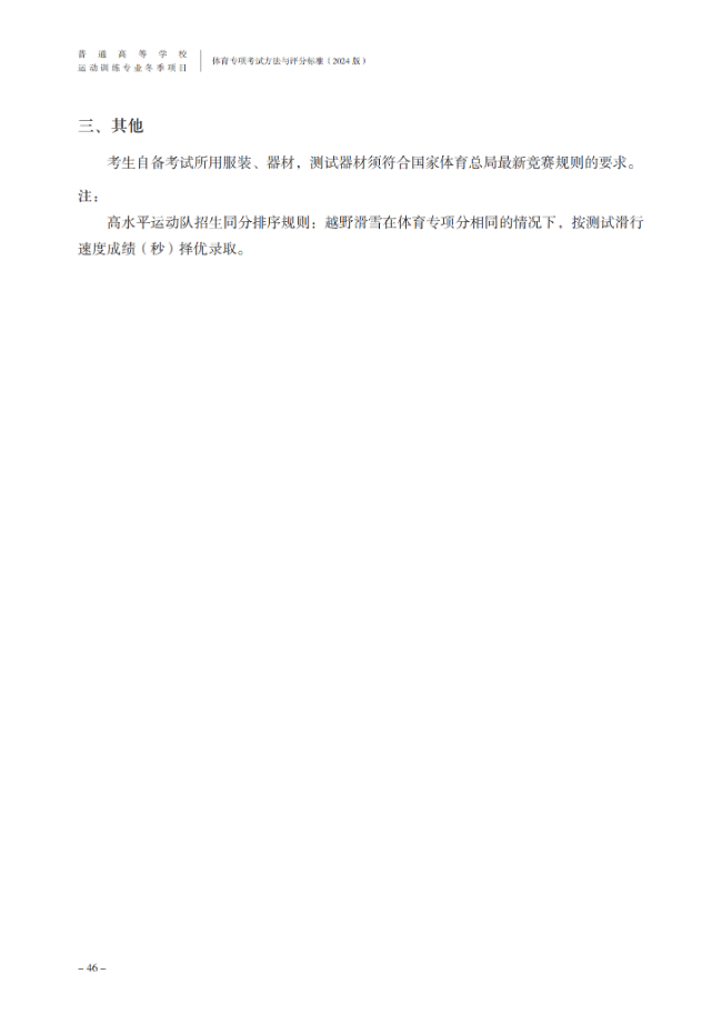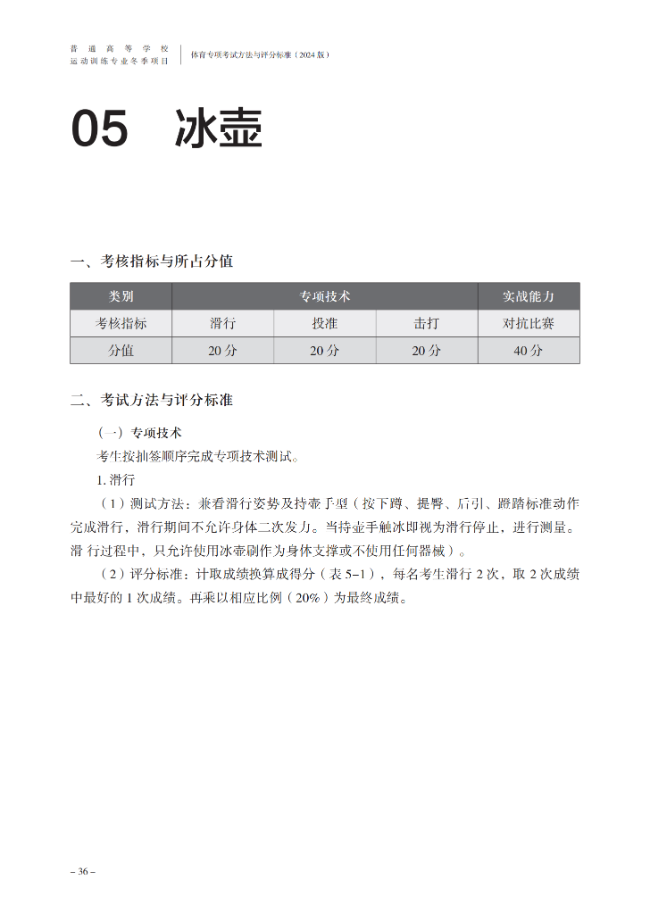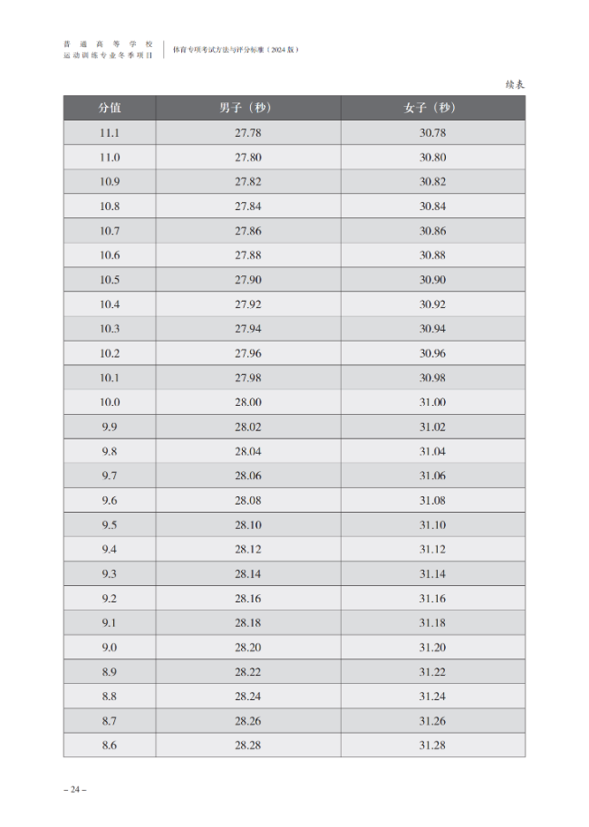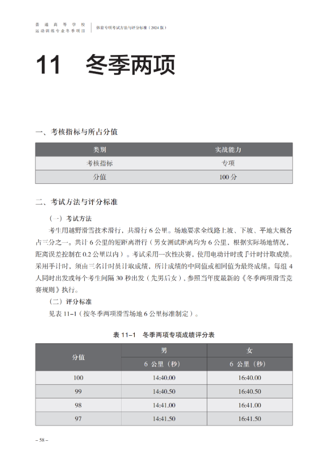 普通高等学校运动训练专业 冬季项目体育专项考试方法与评分标准(2024版)