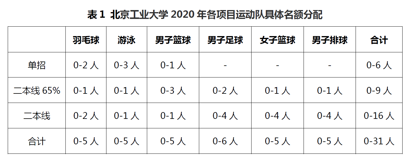 我校2020年继续面向全国招收羽毛球、游泳、男子篮球、男子足球、女子篮球、男子排球项目的高水平运动员,总人数不超过31人。各项目运动队具体分配名额如表1所示。
