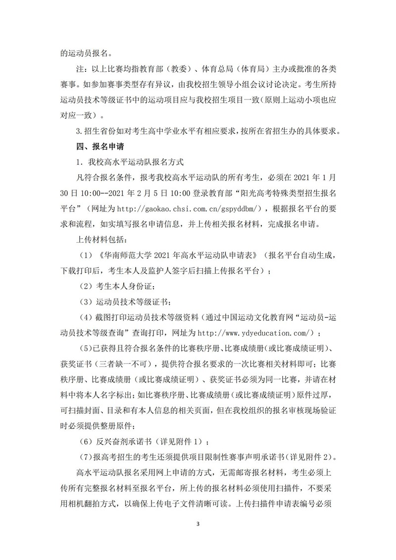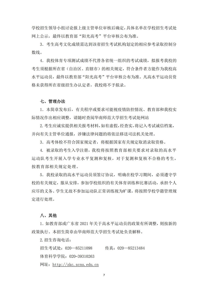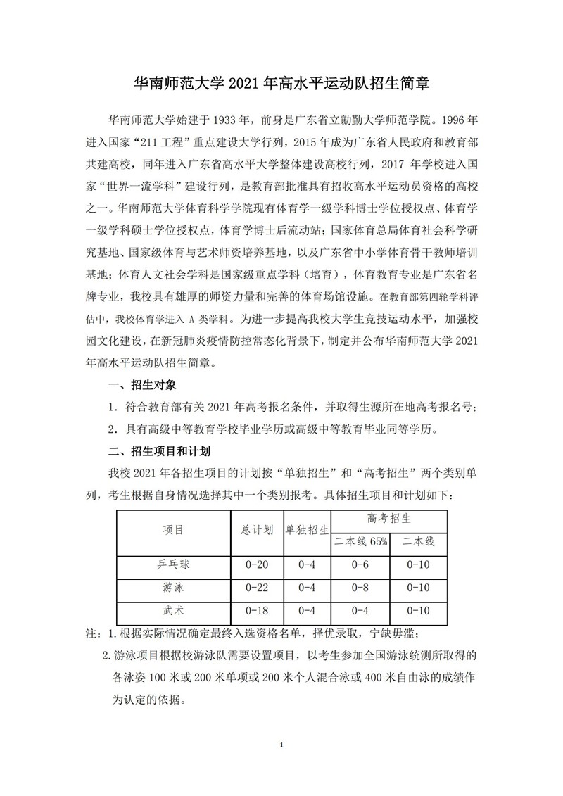 华南师范大学2021年高水平运动队招生简章