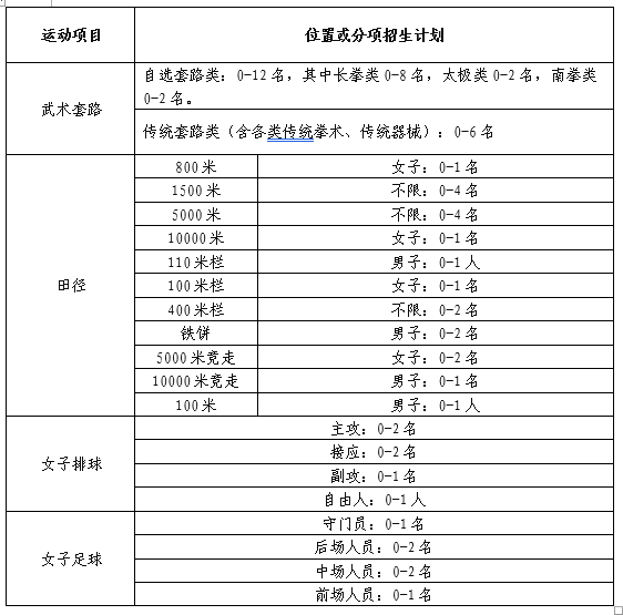 2.武术、田径、女子足球由体育总局科教司统一组织全国统测,我校不再单独组织专项测试。考生自行按照“中国运动文化教育网”或“体教联盟”手机APP上相关要求参加测试。