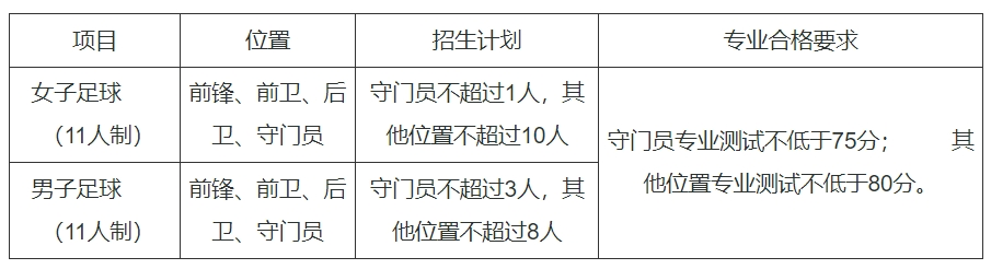 招生项目为男子足球(集体项目)、女子足球(集体项目)。招生总计划严格按照教育部的有关规定执行,不超过我校上一年度本科招生计划总数的1%。具体计划如下: