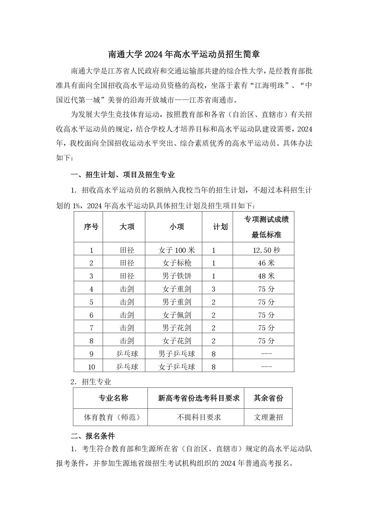 南通大学2024年高水平运动员招生简章