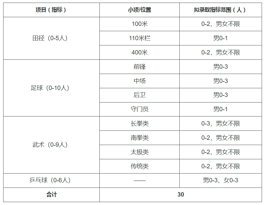 2024年计划招收田径、足球、武术、乒乓球项目共计30人,各项目招生名额如下: