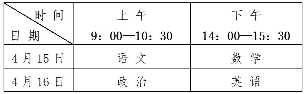 文化考试科目为语文、数学、政治、英语四科,每科满分为150分,四科满分为600分,使用国家通用语言文字作答。