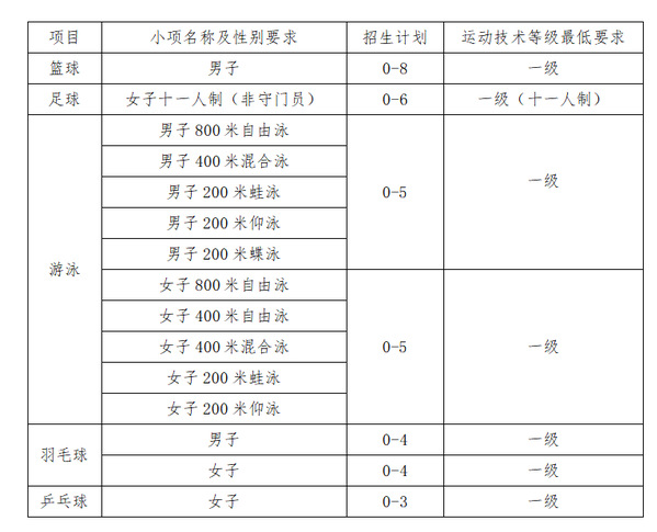 5.计划调整办法:若某一项目第一志愿最低录取控制线上生源不足时,则将该项目剩余计划调整到其他项目,按照篮球(男子)→乒乓球(女子)→游泳(男子)→游泳(女子)→足球(女子,十一人制,非守门员)→羽毛球(男子)→羽毛球(女子)的项目顺序依次增加,每轮每个项目增加1个计划,直到完成招生计划。