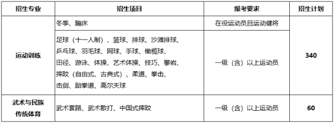 运动训练、武术与民族传统体育专业系国家计划内的全日制本科专业,学制四年。招生计划(含保送录取优秀运动员)为拟定计划,正式计划以上级部门下达为准。面向全国招生,不列分省计划。