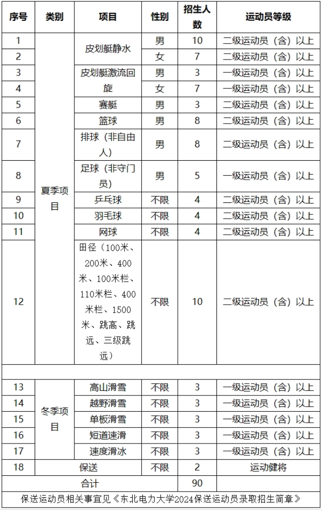 2.具备我校招生项目要求的运动员技术等级称号。考生运动员技术等级以“国家体育总局运动员技术等级系统”公示的数据信息为准。报名考生的等级证书审批日期为:冬季项目为2014年1月1日至2023年12月31日;夏季项目为2014年1月1日至2024年3月10日。