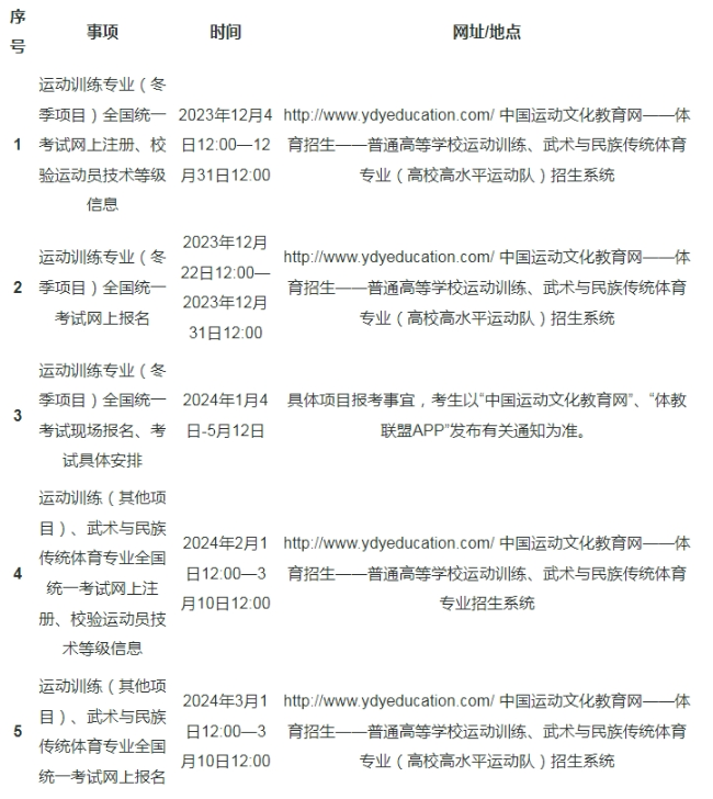 考生均须参加高考报名所在地省级招生考试机构组织的运动训练、武术与民族传统体育专业文化考试,考生可于3月23日12:00后登录“中国运动文化教育网”—“体育招生”—“普通高等学校运动训练、武术与民族传统体育专业(高校高水平运动队)招生系统”打印文化考试《准考证》。