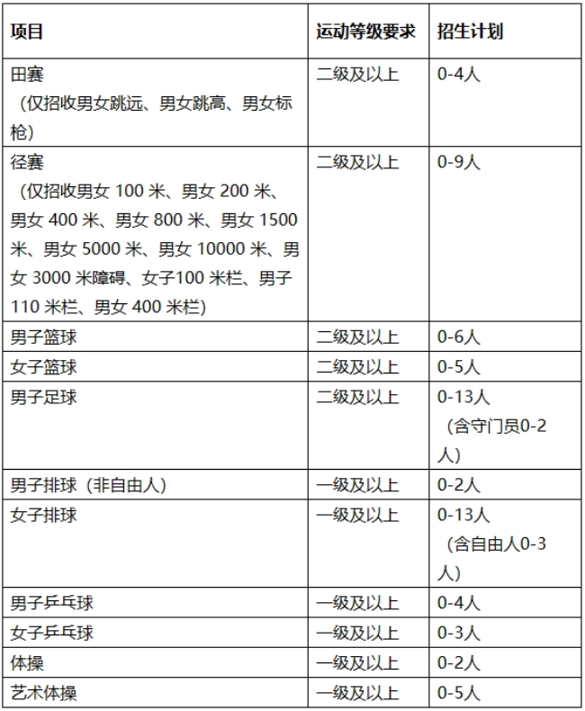 (2)学校体育专项成绩录取控制线:径赛90分,田赛85分,篮球75分,男子足球85分,女子排球非自由人85分,女子排球自由人90分,男子排球(非自由人)90分,体操88分,艺术体操88分,乒乓球80分。