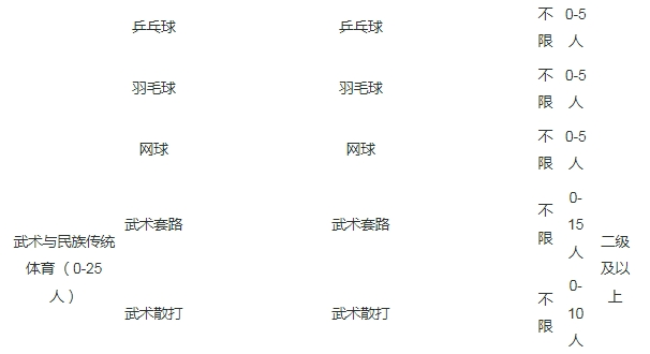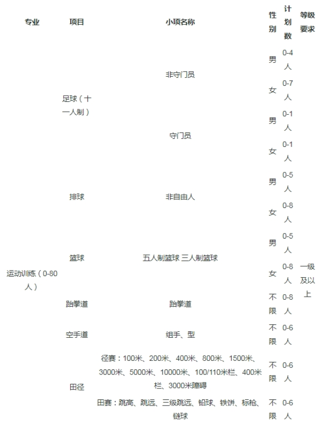 1.运动训练专业招收足球(十一人制)、排球(非自由人)、篮球、跆拳道、空手道、田径、乒乓球、羽毛球、网球9个项目。