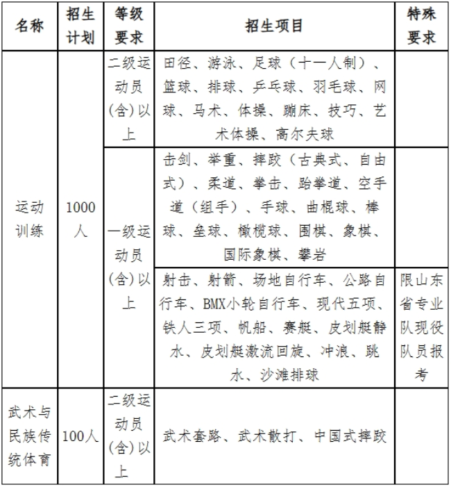 培养目标:依据国家和山东省社会经济发展需求,面向山东省、辐射全国,培养思想品德优秀,具有较好科学文化素养、高度社会责任感,掌握专项运动教学、训练、竞赛、体育运动与健康促进的基本理论与方法,具备较强的专项运动技能、运动训练指导及竞赛组织能力,能够胜任基层专项运动教学、训练和竞赛工作,具有健全人格和明显社会竞争力的高素质体育应用型人才。