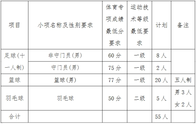 (1)足球(男子,十一人制)项目招收一级及以上运动等级运动员,非守门员项目体育专项成绩不低于60分,守门员项目体育专项成绩不低于75分。
