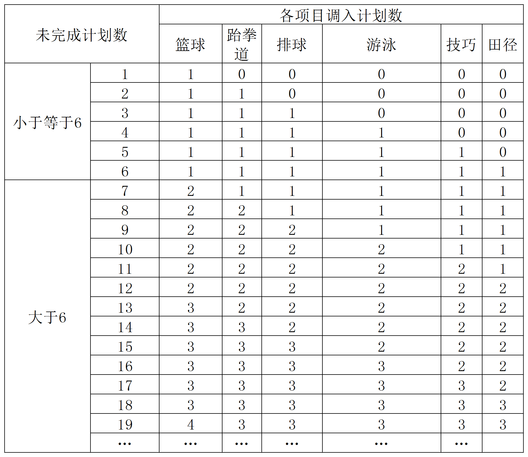 3.经以上两个优先调整步骤仍未完成的项目计划,均向学校重点发展的六个项目篮球、跆拳道、排球、游泳、技巧、田径倾斜调整,不分男女按综合分由高至低进行录取。具体调整原则如下:以单个计划数的形式,按照篮球、跆拳道、排球、游泳、技巧、田径的顺序,按照轮次依次调入六个项目(无生源的项目轮空),以此类推,调完未完成的计划为止。例: