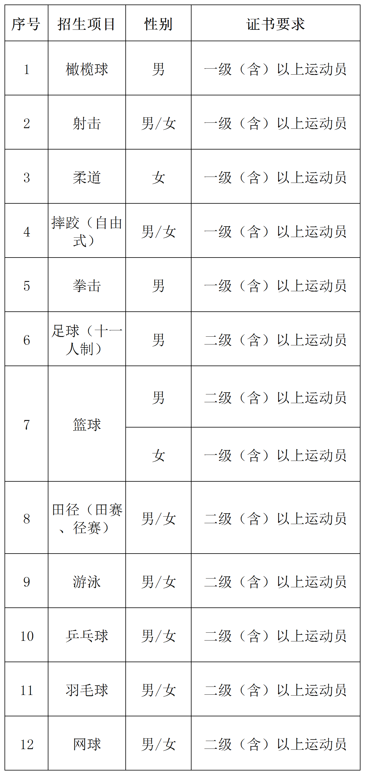 按照体育总局办公厅《关于做好2024年高校保送录取优秀运动员有关事宜的通知》(体科字〔2023〕178号)文件执行,招生专业为运动训练,招生项目为橄榄球(7人制)、射击。