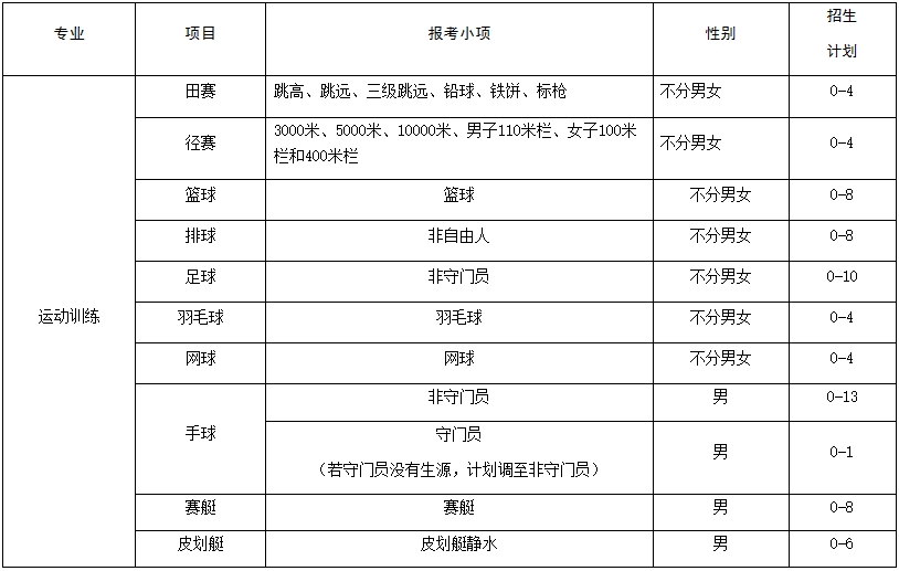 运动训练专业招收田径、篮球、排球(非自由人)、足球(十一人制)、网球、羽毛球、手球、赛艇和皮划艇9个项目。