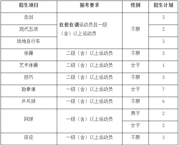 (二)考生需满足相应报考项目的招生运动员技术等级要求,且考生符合报考要求的运动员技术等级的运动项目必须与招生计划中公布的运动项目一致。