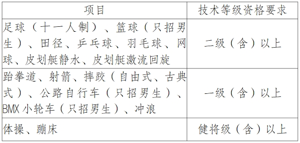 (二)考生必须具备所列招生项目之技术等级资格要求。考生运动技术等级证书符合《2024年普通高等学校运动训练、武术与民族传统体育专业招生管理办法》要求,以“国家体育总局运动员技术等级系统”公示的数据信息为准。考生本人的运动员技术等级项目应与报考的招生项目一致,考生如具备所报考项目的多个运动员技术等级证书,报名时需填报所有符合报名要求的运动员技术等级证书。