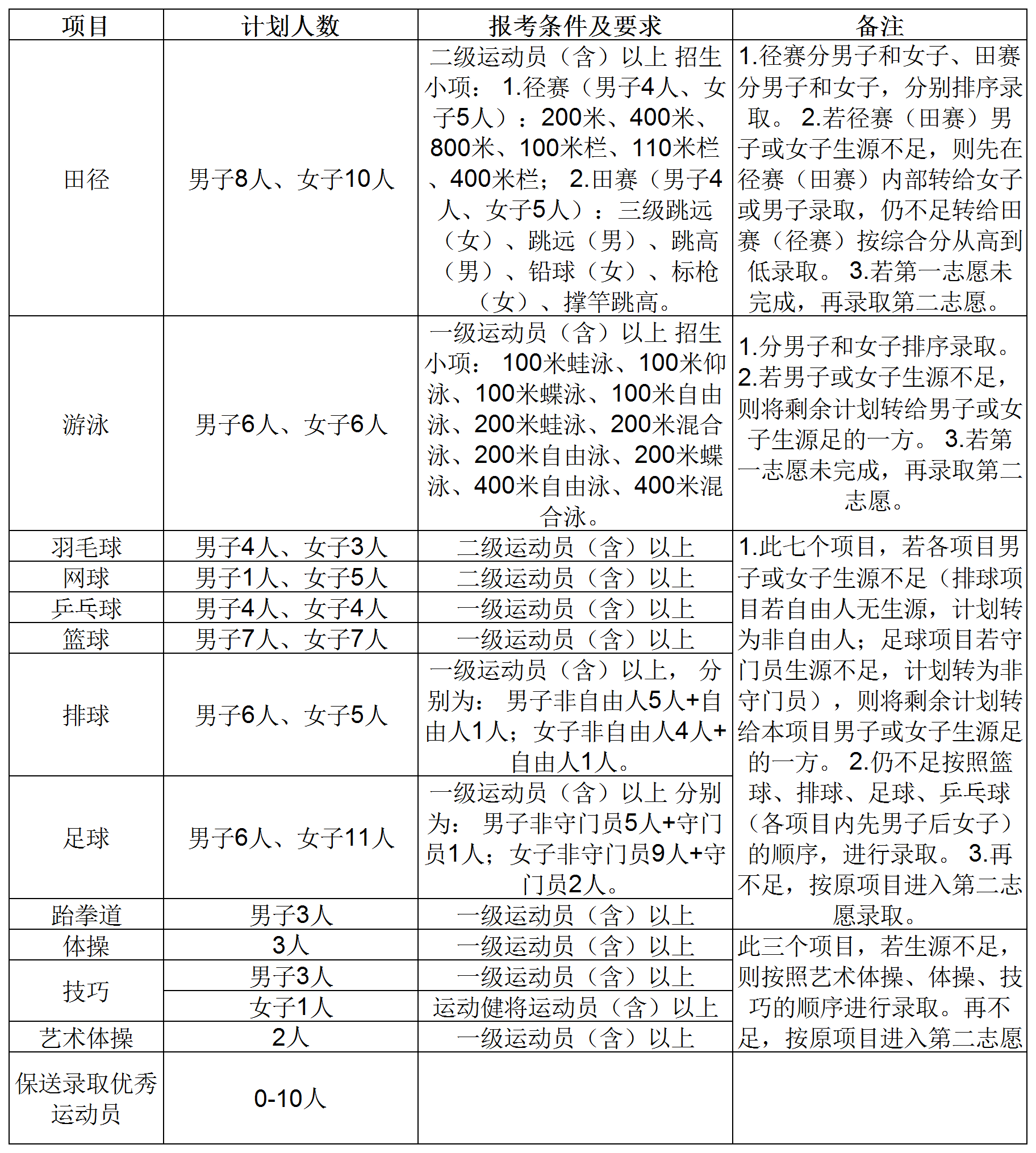 1.面向全国计划招收115人(含保送录取优秀运动员),均为全日制在校培养。考生本人的运动员技术等级项目应与报考的招生项目一致,考生如具备所报考项目的多个运动员技术等级证书,报名时需填报所有符合报名要求的运动员技术等级证书。
