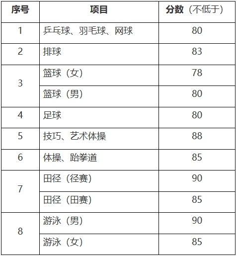 1.文化考试成绩及体育专项考试成绩须达到我校划定的最低录取控制分数线(文化成绩录取控制分数线不低于180分,体育专项成绩录取控制分数线见表2)。对具备一级运动员等级的考生,可在我校文化成绩最低录取控制线下降低30分录取;对具备运动健将技术等级的考生,可在我校文化成绩最低录取控制线下降低50分录取。
