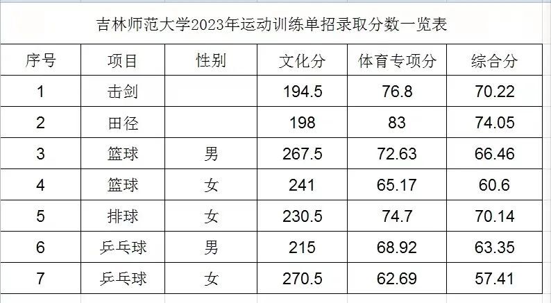 1.文化成绩录取控制线180分。击剑、田径和篮球专项成绩录取控制线65分,乒乓球和羽毛球专项成绩录取控制线40分。