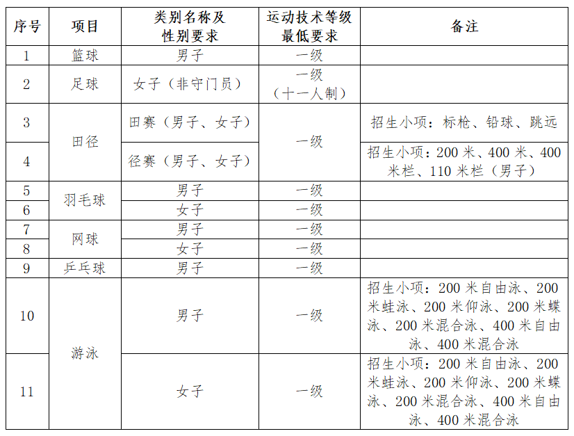 我校招生项目包括:篮球、足球、田径(田赛、径赛)、羽毛球、网球、乒乓球、游泳。招生计划总数为42名,按照上级部门规定,各项目最终招生人数视我校生源实际情况和项目需求而定。各项目具体如下。