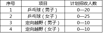 1.文化课:依据体育专项测试,择优录取已参加2020年普通高校运动训练、武术与民族传统体育专业单独招生文化课考试且成绩达到我校划定的文化课合格线以上的考生不多于13人(乒乓球项目不多于9人,定向越野项目不多于4人)。