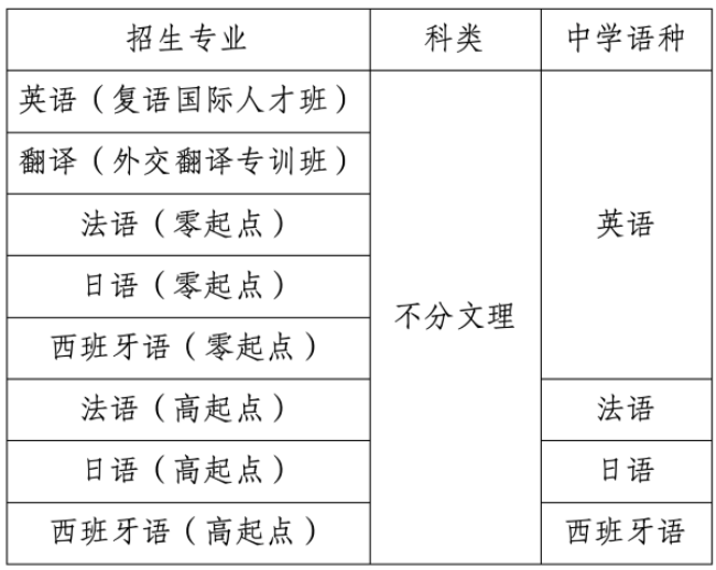 第六条 经教育部批准具有推荐保送生资格的外国语中学中具有保送生资格,符合当年高考报名条件,身心健康,品学兼优,德智体美劳全面发展,有志于从事外交外事、翻译、国际问题研究、涉外法律、经济、文化交流和国际传播工作的应届高中毕业生。