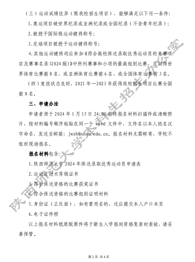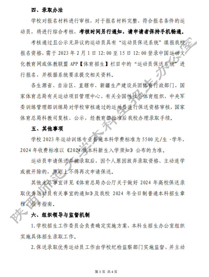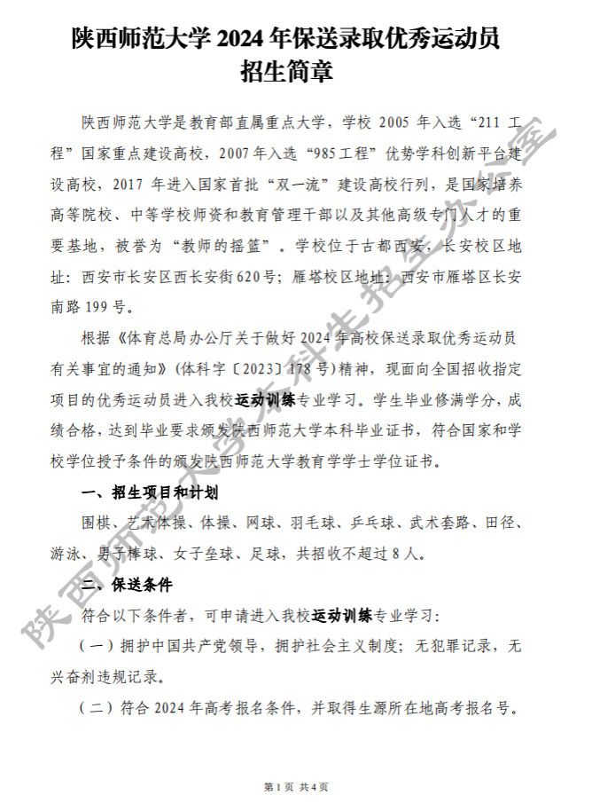 陕西师范大学2024年保送录取优秀运动员招生简章
